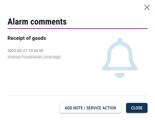 Notes can contain additional information, such as the cause of the alarm, remedial actions taken, or other important details. Added comments are visible in the alarm details. They cannot be edited or deleted, it is only possible to add further notes to the alarm.