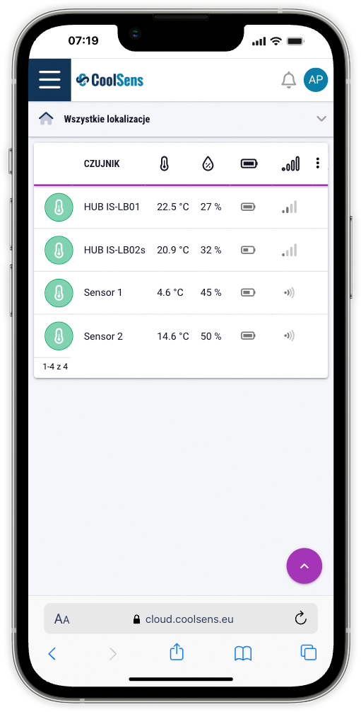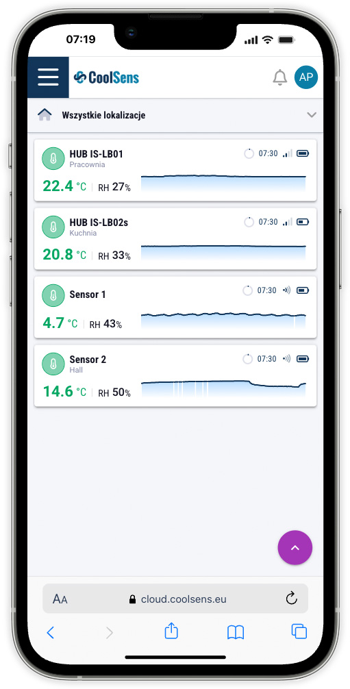 Pulpit wyświetlany po uruchomieniu aplikacji prezentuje kluczowe informacje odczytywane przez urządzenia monitorujące. Zawiera on wszystkie koncentratory i czujniki dodane do konta, niezależnie czy zostały już uruchomione, skonfigurowane i czy przesłały jakie dane do chmury.