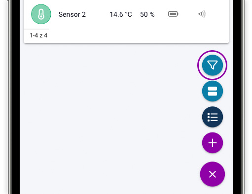 Przycisk filtrowania typów urządzeń pozwala na szybkie wyszukanie wszystkich koncentratorów bądź wyświetlenie samych czujników. Kliknij odpowiedni przycisk aby włączyć filtrowanie, kliknij go ponownie, aby wyłączyć filtrowanie.