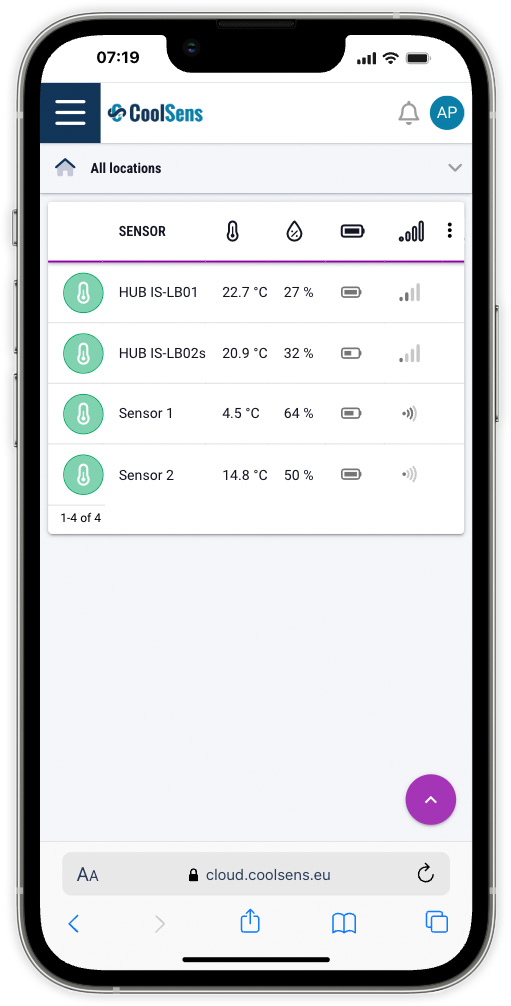 The most crucial parameter monitored by the CoolSens system is air temperature. Therefore, the temperature value is displayed in the largest font and additionally presented in a chart showing temperature changes over the past 24 hours.