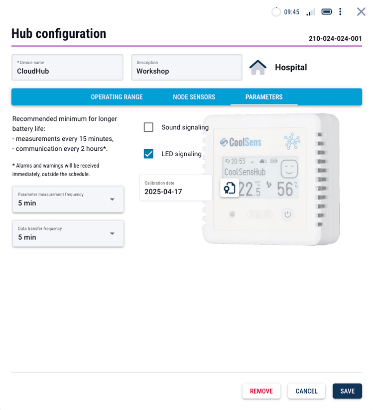 - PARAMETERS: This tab includes additional parameters that affect the device’s operation, such as the frequency of measurements and transmissions, and the configuration of the buzzer and indicator light. Learn more here.