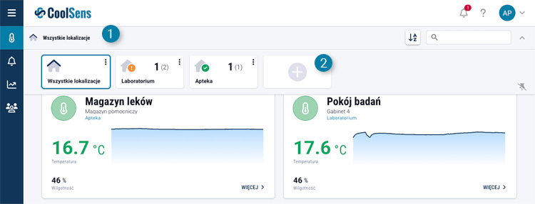 Każde urządzenie w systemie CoolSens musi być przypisane do jednej z lokalizacji. Przy tworzeniu konta tworzona jest pierwsza lokalizacja i do niej przypisane zostaje pierwsze urządzenie. Kolejno dodawane urządzenia są automatycznie przypisywane do tej lokalizacji.